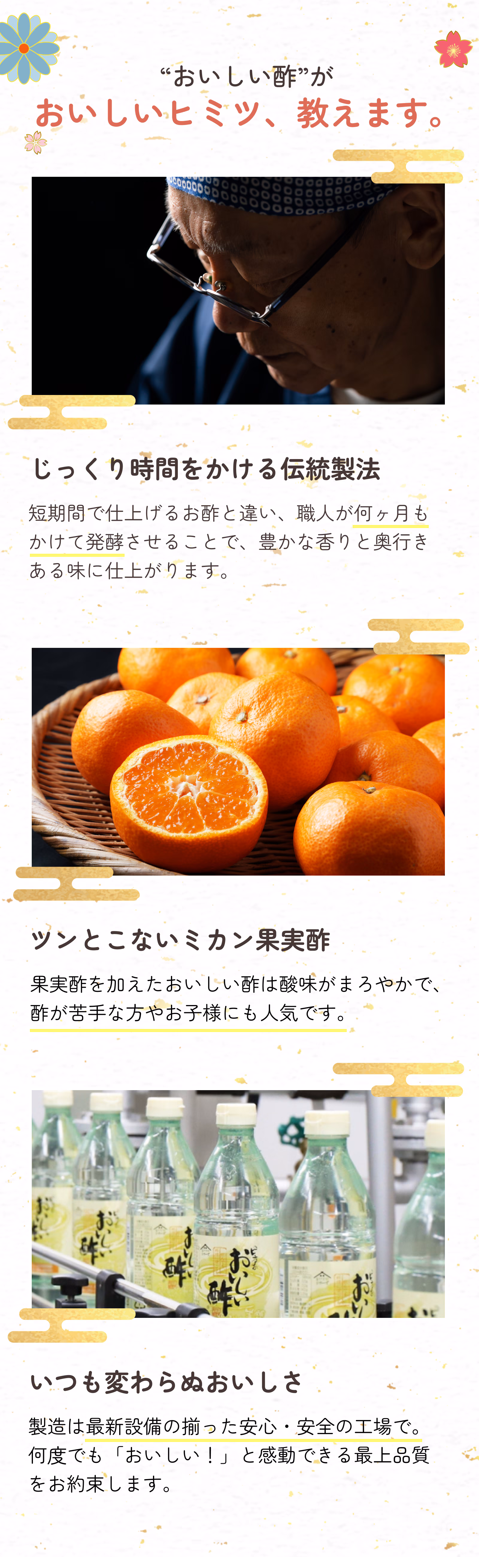 昔ながらの製法でつくった米酢に、みかん果実酢を配合しました。まろやかな酸味と爽やかな甘味があり、酢が苦手な方にも大好評です。料理にはもちろん、野菜や果物、らっきょうなどを漬けたり、サラダにそのままかけたり、水などで薄めて飲んでもおいしい酢に仕上げました。
