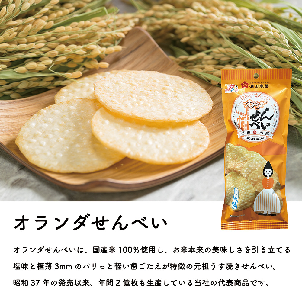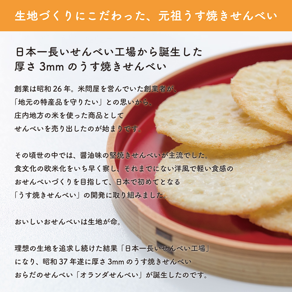 代表商品「オランダせんべい」は、国産のうるち米を100%使用し、極薄の3mmに焼き上げた元祖うす焼きせんべいです。軽い食感で食べるとお米の風味広がる1品となっています。